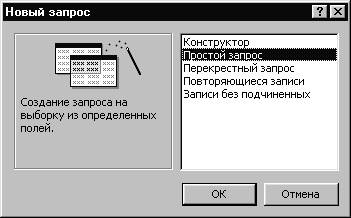 Рисунок 1 – Диалоговое окно выбора способа создания запроса При выполнении запроса СУБД Access выбирает нужные данные из соответствующей таблицы или собирает данные из разных таблиц, производит при необходимости их обработку и представляет результат в виде новой таблицы. При этом результат запроса не сохраняется, т.е. таблица запроса существует только как результат выполнения запроса, а в самом запросе сохраняется только инструкция по выборке и обработке данных. Таким образом, запрос в СУБД Access представляет собой некую программу, написанную на т.н. языке запросов SQL (Structured Query Language – язык структурированных запросов, англ., см. подробнее подраздел 3). Для создания запросов СУБД Access предлагает несколько вариантов (см. рис. 1). При этом в режиме Конструктор запрос создается полностью самим пользователем на основе специальной таблицы QBE (Query by Example – запрос по образцу, англ.), а другие способы используют соответствующих Мастеров, где запрос создается полностью путем выбора предлагаемого готового варианта и по наводящим подсказкам.