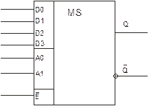 Рисунок 1 – Умовне графічне позначення мультиплексора Функціонально мультиплексор складається з m елементів кон’юнкції, виходи яких об'єднані диз’юнктивно за допомогою елемента АБО з m входами. На одні входи всіх елементів кон’юнкції подаються інформаційні сигнали, а інші входи цих елементів з'єднані з відповідними виходами дешифратора з n входами. Функція алгебри логіки, що описує роботу мультиплексора, має вигляд: Q = D0A1’A0’E’ + D1A1’A0E’ + D2A1A0’E’ + D3A1A0E’. Мультиплексор містить дешифратор на відповідне число виходів (число виходів дешифратора визначається числом інформаційних входів мультиплексора), елементи кон’юнкції на два або на три входи кожний та елемент диз'юнкції із числом входів, рівним кількості інформаційних ліній D0... Dm. Число входів елементів І може бути рівним тільки двом. Одні із входів всіх елементів кон’юнкції поєднуються і по цій лінії подається сигнал дозволу роботи мультиплексора (стробуючий сигнал). Демультиплексором називається комбінаційний цифровий пристрій, призначений для керування передачею даних від одного джерела інформації до декількох вихідних каналів. Згідно даного визначення, демультиплексор в загальному випадку має один інформаційний вхід, n адресних входи та 2 n виходів. Функції алгебри логіки, що описує роботу демультиплексора, мають вигляд: Q0 = DA1’A0’E’ Q1 = DA1’A0E’ Q2 = DA1A0’E’ Q4 = DA1A0E’.