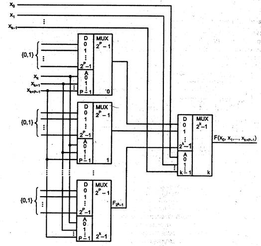 Рис 2.4. Структура УЛМ, построенного на нескольких мультиплексора Показанная пирамидальная структура — каноническое решение, которое приводит к нужному результату, но не претендует на оптимальность. Дело в том, что варианты построения схем из нескольких мультиплексоров для воспроизведения функций многих переменных разнообразны, но алгоритм поиска оптимальной по затратам оборудования или какому-либо другому критерию отсутствует. Имеются работы, в которых найдены решения более высокого качества, но это результаты изобретений, касающиеся частных случаев и не относятся к регулярному методу поиска структур. При чисто электронной настройке константами 0 и 1 схема воспроизводит функцию n аргументов, где n = к + р. причем к — число аргументов, подаваемых на мультиплексор второго яруса, р — число аргументов, от которых зависят остаточные функции, воспроизводимые мультиплексорами О... 2k - 1 первого яруса. Для уменьшения аппаратных затрат в схеме следует стремиться к минимизации числа мультиплексоров в столбце, т. е. минимизации k и соответственно, максимальным р, поскольку их сумма к+ р постоянна и равна n. Сигналы настройки для мультиплексоров первого яруса можно искать разными способами: 1. Подстановкой (фиксацией) наборов аргументов, подаваемых на адресные входы мультиплексоров для получения остаточных функций и, далее, сигналов настройки. Этот способ уже рассмотрен (см. табл. 1). 2. С помощью разложения функции по Шеннону. Это разложение можно произвести по разному числу переменных. По одному из аргументов разложение имеет вид Справедливость такого разложения видна из подстановки в него значении Xo=0 и Хо = 1, что дает непосредственно функции F (0, x1,…., xn-1) и F (1, x1,…., xn-1) (.1, Х1,...,Х„-1). Разложение функции по двум аргументам наконец, разложение по К аргументам где Fo=F(0,0,…,0, xk,…, xn-1), Fo=F(0,0,…,0, xk,…, xn-1), F 2k-1=F(1,1,…,1, xk,…, xn-1). Структура формул разложения полностью соответствует реализации двухъярусным УЛМ. В первом ярусе реализуются функции р„ (1 = 0,..., 2^ — 1), зависящие от п — 1с аргументов, которые используются как настроечные для второго яруса, мультиплексор которого воспроизводит функцию 1< аргументов. 3. Сигналы настройки можно получить непосредственно из таблицы истинности функции. Для удобства просмотра таблицы ее следует записать так чтобы аргументы, переносимые в сигналы настройки, играли роль младших разрядов в словах-наборах аргументов. Пусть имеется функция 4-х переменных x3 x2x1x0, и переменная x3 считается старшим разрядом вектора аргументов. Пусть, далее, функция задана перечислением наборов аргументов, на которых она принимает единичные значения, причем заданы десятичные значения этих наборов: 3, 4, 5, б, 7, 11, 15. Заметим, что аналитическое значение этой функции имеет вид F = x0 x1 x2x3 Значения функции сведены в табл. 2