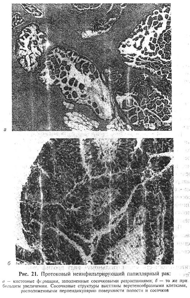 Миоэпителиальные клетки в части протоков сохраняются, в части отсутствуют. Вокруг некоторых протоков в строме иногда возникает характерный концентрический фиброз, который с течением времени образует плотные муфты из гиалинизированных коллагеновых волокон. В соединительной ткани, окружающей протоки; содержащие опухолевые клетки, нередко определяется лимфоцитарная инфильтрация разной степени выраженности. Микроскопическая картина комедокарциномы настолько характерна, что обычно не вызывает дифференциально-диагностических трудностей. Однако после установления диагноза комедокарциномы необходимо продолжить исследование с целью поиска очагов стромальной инвазии.Частота выявления микроочагов инвазии прямо пропорциональна количеству исследованных гистологических срезов. При изучении серийных срезов микроскопические очаги инвазии выявляются у 21% больных комедокарциномой. Существует мнение, что при комедокарциноме чаще, чем прикакой-либо форме протоковой неинфильтрируюшей карциномы, могут быть обнаружены метастазы в регионарных лимфатических узлах, даже при отсутствии инвазивного компонента. Папиллярный внутрипротоковый рак. Папиллярный неинфильтрирующий протоковый рак - очень редкий вариант опухоли. Частота его составляет 0,2-0,5% от общего числа всех карцином молочной железы. Наиболее часто опухоль выявляется в четвертом-шестом десятилетиях жизни - 60% женщин находятся в менопаузальном периоде. Макроскопическая картина может быть достаточно разнообразной. В части случаев опухоль может иметь вид четко очерченного узла плотноэластической консистенции, нередко с хорошо выраженной капсулой. Такой узел зачастую бывает подвижен относительно окружающих тканей молочной железы. Благодаря четкой очерченности и подвижности опухоль может клинически и макроскопически имитировать фиброаденому. В других случаях сосочковый неинфильтрируюший рак имеет вид нечетко очерченного очага уплотнения эластической консистенции, напоминающего фиброкистозную болезнь. Просветы расширенных протоков и мелких кист при этом выполнены серо-белой массой. Иногда на поверхности разреза видна киста диаметром до 10 см, в той или иной степени заполненная крошащимися сосочковыми разрастаниями. В редких наблюдениях выявляется, так называемая, внутрикистная папиллярная карцинома, представляющая собой пристеночный плотный узел в крупном кистозном образовании. Столь широкое разнообразие макроскопической картины придает особо важное значение микроскопическим критериям при диагностике внутрипротоковой папиллярной карциномы. Микроскопическую дифференциальную диагностикунеобходимо проводить с доброкачественными папиллярными поражениями, к числу которых относятся, прежде всего, цистаденопапилломы и пролиферативные варианты фиброкистозной болезни. При этом необходимо учитывать, что папиллярный внутрипротоковый рак выявляется очень редко, в более старших возрастных группах и имеет более крупные размеры, чем доброкачественные папиллярные поражения. Микроскопическая картинапапиллярного внутрипротокового рака имеет свои характерные особенности. Кистозные формации и сосочковые структуры выстланы овальными или веретенообразными эпителиальными клетками. Последние обычно располагаются перпендикулярно поверхности сте