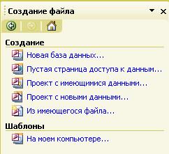 Процесс создания базы данных рассмотрим на примере описанной ранее (лекция 3) модели базы данных информационной системы "Контингент студентов университета". В системе Microsoft Access процесс создания базы данных выполняется следующим образом. При запуске системы появляется диалоговое окно для выбора режима работы (рис. 7.1), в котором следует выбрать пункт Новая база данных...