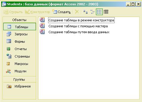 После выбора первого пункта появляется окно для задания пути сохранения и имени новой базы. Выберем папку на диске для сохранения файла базы данных и зададим имя базы - STUDENTS, нажмем на кнопку Создать, после чего откроется окно базы данных. Далее необходимо задать структуру таблиц в соответствии с описанной ранее концептуальной моделью. Можно также воспользоваться сгенерированной ранее системой Case Studio - программой создания таблиц базы данных, однако, далее описан режим создания таблиц с помощью Конструктора. Умение использовать этот режим необходимо каждому пользователю для создания новых таблиц и модификации структуры уже существующих. Выберем пункт Создание таблицы в режиме конструктора (рис. 7.2) и опишем структуру главной таблицы базы данных, т.е. зададим имя, тип, размер каждого поля таблицы, а также первичный ключ (если необходимо), индексированные поля и подпись (рис. 7.3). Имена полей лучше писать латинскими буквами, в одно короткое слово - для удобства использования их в запросах и программах, работающих с базой данных; задание подписей для полей облегчает разработку экранных форм и отчетов.