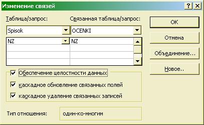 Далее задаем связи Один ко многим между таблицами в базе, открыв окно Схема данных (выбрав эту команду в контекстном меню для окна базы данных) и перетаскивая название поля первичного ключа к аналогичному полю другой таблицы (см. рис. 7.4.). При этом задаем в окне Изменение связей (см. рис. 7.5.) условия соблюдения ссылочной целостности данных: каскадное обновление связанных полей и каскадное удаление связанных записей.