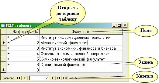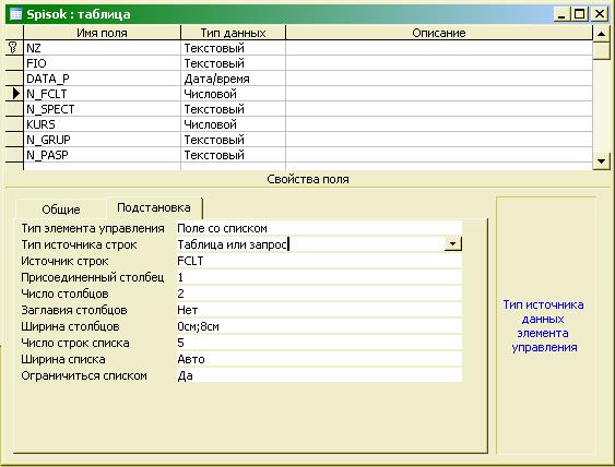 В таком режиме каждая запись таблицы базы данных представлена как строка, состоящая из столбцов - полей, над которыми показаны подписи полей или, при их отсутствии, имена полей. В нижней части таблицы присутствует пустая запись с символом * в левой колонке - это несуществующая запись, которая добавляется в таблицу, как только в ней появляется какая-либо информация. На нижней рамке окна находятся кнопки для перемещения по таблице, номер текущей записи и информация об общем количестве записей в таблице. Колонка слева с символом + имеется в наличии, если у таблицы есть связь от одной записи данной таблицы ко многим записям связанной с ней таблицы. В данном случае при щелчке мышью на плюсе откроется как подтаблица - список студентов для соответствующего факультета. Настройка подтаблицы присутствует в главном меню в разделе Вставка. В системе Microsoft Access существуют также дополнительные возможности использования в таблицах режима "Подстановка" для показа и выбора данных из раскрывающихся списков ("тип источника строк" - таблица или запрос, список значений или список полей). Этот режим можно создать с помощью Мастера, если выбрать тип поля "Мастер подстановок" или описать самому на странице "Подстановка". В примере этот режим задан для поля N_FCLT таблицы Spisok (см. рис. 7.8.). В дальнейшем для поля с описанными свойствами раздела "Подстановка" на экранной форме будет автоматически создаваться объект типа "Поле со списком".