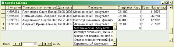 Вид таблицы Spisok с использованием поля со списком для поля N_FCLT показан на рис. 7.9.