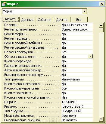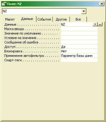 Все свойства в окне разбиты на группы: Макет - расположение, шрифт, цвет и прочее, связанное с внешним видом объекта; Данные - в этом разделе важнейшее свойство - Данные или Источник записей - для объектов, связанных с редактированием каких-либо данных; События - методы, т.е. процедуры (программы), выполняющиеся для объекта при наступлении определенных событий (Загрузка, Открытие, До обновления, После обновления и пр.); Другие - прочие свойства. На экранной форме присутствуют элементы (объекты) следующих типов: Надпись - текст на форме, обычно не изменяющийся. Главные свойства этого объекта присутствуют на странице Макет окна свойств (рис. 7.12.). Поле - поле редактирования, связанное с полем базы данных или переменной. Главное свойство этого объекта - строка Данные на странице Данные окна свойств (рис. 7.13.).
