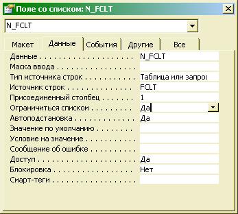 Подчиненная форма - вложенная форма для таблицы данных, связанной с главной таблицей, на которой могут присутствовать такие же элементы, как и на основной форме. Поле со списком - сложный элемент, предоставляющий возможность показывать данные справочных таблиц, списков или массивов и заносить выбранные значения в поле другой таблицы (9-й элемент панели, окно свойств, см. рис. 7.14.).