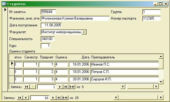 В режиме работы с базой данных в усовершенствованной форме можно видеть названия факультетов, специальностей, предметов и выбирать их из справочных таблиц с помощью раскрывающихся списков (рис. 7.19.).