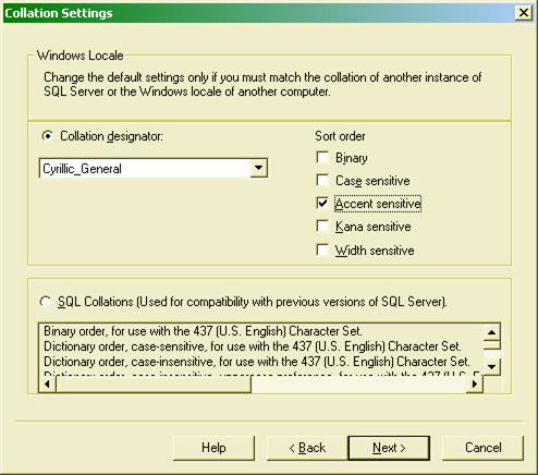 Следующее окно - задание кодовой страницы и параметров сортировки данных. Здесь можно задать параметры, установленные на компьютере или отдельно заданные для системы SQL Server (рис. 8.10).