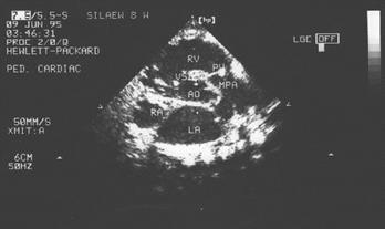 Это самый частый "синий" порок. Тетрада Фалло - это сочетание 4 признаков: стеноз легочной артерии вплоть до полного закрытия просвета, декстрапозиция аорты (аорта как бы сидит верхом на правом и левом желудочках, то есть сообщается с ними обоими), дефект межжелудочковой перегородки и гипертрофия правого желудочка. Сопровождается с раннего детства стойким цианозом. Симптомы и течение. Одышка появляется еще в детстве, обычно связана даже с небольшой физической нагрузкой, иногда носит характер удушья. Дети зачастую ищут облегчения в положении сидя на корточках, привыкают сидеть, подложив под себя скрещенные ноги, и спать с подтянутыми к животу коленями. Они немощны, зябки, у них нередки обмороки и судороги. На самочувствие неблагоприятно влияют изменения атмосферных условий, чрезмерная жара, холод – усиливается одышка, общая слабость, синюшность. Могут появиться нервные расстройства. У детей бывают нарушения пищеварительной системы, у подростков - сердцебиения, чувство тяжести в области сердца при мышечной нагрузке. Задерживается физическое развитие и рост ребенка, запаздывает умственное и половое. Обращает на себя внимание несоответственно длинные и тонкие конечности, особенно нижние. Важные признаки - синюшные пальцы, утолщенные в виде барабанных палочек. Над сердцем выслушивается грубый систолический шум. Шум имеет два эпицентра - один в зоне Боткина-Эрба; второй - на лёгочной артерии. II тон над легочным стволом ослаблен. Осложнения порока - комы, связанные со снижением содержания кислорода в крови, тромбозы, частые пневмонии, инфекционный эндокардит, сердечная недостаточность. Средняя продолжительность жизни 12 лет. ЭКГ: Гипертрофия правого желудочка и предсердия. Одномерная ЭхоКГ: 1. Отсутствие переднего продолжения. 2. Дилатация аорты. 3. Декстрапозиция аорты (расположение передней стенки аорты и межжелудочковой перегородки на разной глубине). 4. Гипертрофия передней стенки правого желудочка. 5. Гипертрофия межжелудочковой перегородки. 6. Уменьшение диаметра легочной артерии. 7. Уменьшение левого предсердия. Двухмерная ЭхоКГ: 1. Непосредственная визуализация дефекта межжелудочковой перегородки, смещения аорты и ее дилатации в парастернальной проекции длинной оси. 2.