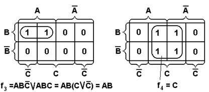 Аналогом диаграмм Вейча являются карты Карно. Они позволяют изображать на плоскости прямоугольника конституенты единицы (нуля) для ФАЛ более четырех переменных. В отличие от диаграмм Вейча, в которых отдельным строкам и столбцам соответствуют отдельные переменные, в картах Карно им можно присваивать значения нескольких переменных. При этом должны быть представлены все возможные комбинации этих переменных, например: Минимизация ФАЛ методом диаграмм Вейча и карт Карно в силу своей наглядности широко используется при ручном процессе минимизации логических функций от небольшого количества переменных, обычно не превышающего пяти. В случае, когда количество переменных больше, необходимо использовать методы, характеризующиеся однозначностью алгоритма, что позволяет автоматизировать процесс минимизации на ЭВМ. Одним из таких методов является метод Квайна и Мак-Класки. Суть метода состоит в следующем: - все конституенты единицы, записанные в виде двоичных кодов, разбиваются на группы, содержащие одинаковое количество единиц; - склеивание производят между конституентами единицы, расположенными только в соседних группах, т.е. в соседних кубах кубического комплекса функции f; - все склеенные конституенты, образующие импликанты, отмечают каким-либо признаком, например звездочкой; - не отмеченные при склеивании импликанты являются простыми и заносятся в импликантную матрицу, в первой строке которой записываются все конституенты единицы функции f, а в первом столбце – все простые импликанты; - в пересечении строк и столбцов импликантной матрицы проставляется звездочка (или другой выделяющий символ) в тех местах, где соответствующая импликанта покрывает конституенту единицы; - ищутся столбцы импликантной матрицы, имеющие только по одной звездочке; - соответствующие этим звездочкам простые импликанты называются базисными и образуют ядро функции f и обязательно входят в МДНФ; - рассматриваются столбцы импликантной матрицы и выделяются те, которые содержат более одной звездочки; - если среди выделенных столбцов существуют такие, которые покрываются базисными импликантами из ядра функции, то они считаются уже учтенными в записи МДНФ, если же выделенные столбцы базисными импликантами не покрываются, то в МДНФ записываются импликанты соответствующих столбцов с минимальным количесвом переменных. Рассмотрим пример минимизации функции f, заданной таблицей 1.3 методом Квайна и Мак-Класски. Функция принимает единичные значения при следующих значениях переменных А, В и С - 000, 010, 011, 111, которые и образуют конституенты единицы. Эти конституенты можно записать в четыре группы по количеству в них единиц: