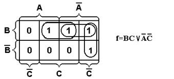 Каждой клетке диаграммы в случае минимизации СДНФ соответствует определенная конситуента единицы. Метод минимизации с помощью диаграмм Вейча заключается в следующем. Конституенты единицы, входящие в СДНФ булевой функции, заносятся в соответствующие клетки диаграммы. Удобно наличие соответствующей конституенты единицы изображать в клетке диаграммы цифрой 1, а отсутствие - 0. Все диаграммы построены таким образом, что рядом расположенные единицы по горизонтали или вертикали склеиваются между собой в соответствии с законом склеивания алгебры логики. Одну и ту же конституенту единицы можно использовать для склеивания с несколькими другими конституентами единицы с целью получения наиболее простого окончательного выражения. Цель всех операций - получить как можно меньшее число прямоугольников (в том числе квадратов), чтобы число членов СДНФ уменьшилось, получив в итоге МДНФ. Формировать прямоугольники можно только при включении в них хотя бы одного нового члена. Склеивание можно осуществлять и путем замыкания крайних ребер в «бочку». Таким образом, полученная диаграмма Вейча геометрически образует цилиндр. На рис. 1.3 приведены некоторые правила склеивания конституент единицы для функций 2-х и 3-х переменных. Поскольку для ФАЛ трех переменных диаграмма представляет как бы развертку цилиндра, разрезанного по Метод минимизации СДНФ с помощью диаграмм Вейча включает в себя следующие шаги: 1. производится занесение в соответствующую диаграмму конституент единицы, входящих в СДНФ минимизируемой функции; 2. используя приведенные выше правила склеивания, находят простые импликанты функций (простой импликантой называется некоторая конъюнкция, полученная в результате склеивания конституент единицы, не участвующая в склеивании ни с одной другой из конъюнкций); 3. находится искомая минимальная дизъюнктивная нормальная форма (МДНФ) ФАЛ выбором минимальной совокупности простых импликант, покрывающей все конституенты единицы диаграммы.