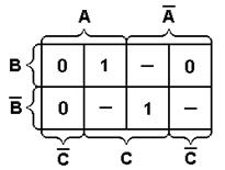 Из матрицы видно, что столбцы, содержащие по одной звездочке соответствуют обеим простым импликантам и, следовательно, обе эти импликанты являются базисными, образуют ядро ФАЛ и входят в МДНФ. Заменяя двоичные коды импликант соответствующими переменными, запишем вид МДНФ: При минимизации частично определенной ФАЛ недостающие наборы выбираются произвольно исходя из соображения получения наименьшего количества простых импликант, по возможности содержащих минимальное количество переменных. На диаграмме Вейча такие импликанты будут определяться максимально большими прямоугольниками. Поэтому при минимизации частично определенной ФАЛ в диаграмму Вейча заносят все определенные значения функции в виде соответствующих нулей и единиц. В неопределенных ячейках дописываются нули и единицы до образования максимально склеиваемых областей, соответствующих простым импликантам с наименьшим количеством переменных. Например, если для заданной функции трех переменных заполненная диаграмма Вейча имеет вид (прочерками указываются неопределенные значения), представленный на рис. 1.5, а, то после дополнения единиц в позициях