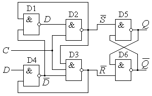 Рис. 9.7. Схема D-триггера с динамическим управлением. Хранение информации в схеме на рис.9.7 осуществяет каскадом асинхронного RS-триггера на вентилях И-НЕ D 5 и D 6, имеющего инверсные входы установки и сброса. Два других каскада триггеров на вентилях D 1, D 2, D 3 и D 4 реализуют механизм динамического управления и коммутации информационного сигнала D и сигнала записи (синхронизации) C. Элемент D 4 формирует инверсное значение сигнала