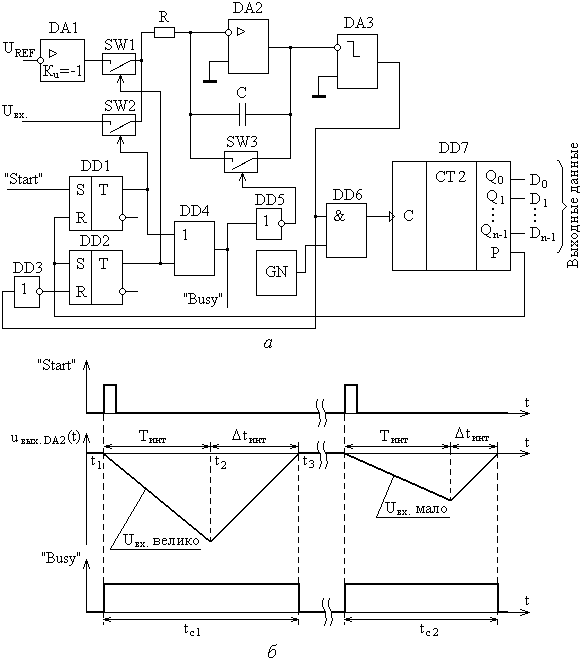Рис. 10.7. Схема (а) и временная диаграмма работы (б) двухтактного интегрирующего АЦП. С открытием ключа SW 1 на вход схемы начинает подаваться опорное напряжение UREF через аналоговый инвертор DA 1, т.е. на вход интегратора оно поступает с отрицательной полярностью. Напряжение UREF можно формировать изначально отрицательной полярности, тогда необходимость в инверторе DA 1 отпадет. Напряжение на выходе интегратора не может измениться скачком, поэтому оно начинает линейно возрастать. В момент времени t 3 оно достигнет нулевого уровня Uвых.DA 2=0, на выходе компаратора DA 3 сформируется уровень логического нуля, который закроет элемент И DD 6, подача счетных импульсов на счетчик прекратится. Одновременно через инвертор DD 3 сбросится в ноль триггер DD 2 и закроется ключ SW 1. На выходах обоих триггеров будут присутствовать нули, которые поступят на входы вентиля ИЛИ DD 4, в результате чего на его выходе сформируется ноль. Этот ноль проинвертируется инвертором DD 5 и откроется ключ SW 3 для разряда конденсатора и приведения его в исходное состояние. На выходе счетчика зафиксируется двоичный код, пропорциональный входному напряжению. Для выходного напряжения интегратора в момент времени t 3 можно записать: