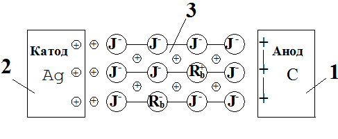 Рис.2.12. Схема полярного ионистора на основе ионного суперпроводника RbAg4J5: 1 - поляризуемый угольный анод, 2 - неполяризуемый серебряный катод, 3 - твердый электролит