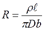 где U – приложенное к резистору напряжение, I - протекающий ток. Отметим, что до 1962 года термин «резистор» в нашей стране не употреблялся и соответствующий элемент называли просто сопротивлением. Это приводило к неоднозначности понятия сопротивления, поскольку последнее имеет значение физической величины, причем может не только активным, но и реактивным, присущим емкостным и индуктивным элементам на переменном токе, а также нулевым и отрицательным. Резистор обладает исключительно активным положительным по величине сопротивлением, которое проявляется при протекании любого тока (постоянного или переменного) при переходе части электрической энергии в тепловую. Это позволяет регулировать и распределять электрическую энергию между узлами, цепями и элементами электрических схем. Основными электрическими параметрами постоянных резисторов являются: 1. номинальное сопротивление R – сопротивление, на которое рассчитан резистор и которое указывается на корпусе резистора. Сопротивление резистора определяется удельным сопротивлением резистивного материала r и геометрией токонесущей части (конструкцией изделия) где S – площадь поперечного сечения токонесущей части. Сопротивление резисторов цилиндрической формы с пленочным резистивным элементом толщиной b < D определяется формулой