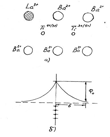 Отметим, что вне указанного диапазона температур ТКС отрицательно, как это обычно бывает у полупроводников. Позисторный эффект наблюдается вблизи точки Кюри при переходе титаната бария из сегнетоэлектрической в параэлектрическую фазу. Температурой, при которой наблюдается скачок сопротивления, можно управлять посредством изменения состава сегнетокерамики. Полупроводниковый титанат бария получают путем легирования трехвалентными атомами (лантан, диспрозий, иттрий, сурьма), которые замещают в кристаллической решетке атомы двухвалентного бария (рис.3.23, а). Рис.3.23. Переходы ионов титана из четырехвалентного состояния в трехвалентное при легировании сегнетокерамики лантаном (а), энергетическая схема межкриталлитного потенциального барьера в сегнетокерамике (б)