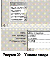 2. Щелкните мышкой по кнопке Конструктор запросов 3. Добавьте таблицу Заказы. 4. Щелкните по стрелке на пиктограмме Тип запроса и выберите команду Удаление. 5. Выберите поле Дата отправки из таблицы «Заказы». 6. Введите условие отбора, как на рисунке 29 (подстановочные знаки «*» и «?» являются действительными в строке Условие отбора для любого типа поля). Для предварительного просмотра удаляемых записей щелкните по пиктограмме Вид на Панели инструментов. После просмотра вернитесь в режим Конструктор. 7. Выполните запрос, щелкнув по пиктограмме Запуск. 8. Подтвердите удаление записей. 9. Закройте запрос, сохранив его с именем Удаление. 10. Откройте таблицу «Заказы» и убедитесь, что записи были удалены. Подведение итогов с помощью Мастера перекрестных запросов. Подсчитаем какое количество книг каждого автора было продано. 1. Мастер перекрестного запроса создает запрос на основе только одной таблицы или одного запроса. Поскольку необходимые данные для создания перекрестного запроса находятся в разных связанных таблицах, сформулируем базовый запрос. 2. Выберите закладку Создание и в режиме Конструктор создайте базовый запрос на основе таблиц «Книги» и «Заказы», с полями как показано на рисунке 30 и сохраните его с именем Продажи.
