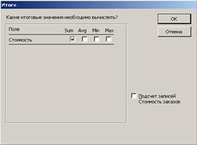 Ход работы 1. Выберите закладку Создание. 2. Щелкните мышкой по кнопке Мастер запросов. 3. Выберите в раскрывающемся списке запрос «Стоимость заказов». Поместите поля Название (значения этого поля необходимы для группировки записей) и Стоимость (значения этого поля будут фигурировать в расчетах) в список Выбранные поля. Щелкните по кнопке Далее. 4. Установите переключатель Итоговый и щелкните по кнопке Итоги. 5. Установите для поля Стоимость флажок Sum (Sum - подсчет суммы, Avg – вычисление среднего значения, Min – вычисление минимального значения, Max – вычисление максимального значения, Count – вычисление количества записей), как на рисунке 32. Щелкните по кнопке ОК, затем по кнопке Далее.