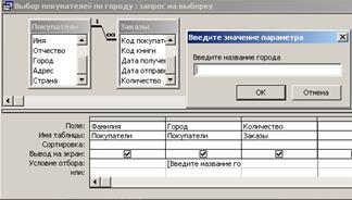 Рисунок 32 – Окно Итоги 6. Задайте имя запроса Итоги продаж и щелкните по кнопке Готово. Построение запроса с параметрами. 1. Запрос с параметрами создается для задания условия отбора данных перед выполнением запроса. При запуске такого запроса на экран выводится диалоговое окно для ввода значений в качестве условия отбора. 2. Выберите закладку Создание. 3. Щелкните мышкой по кнопке Конструктор запросов. 4. Добавьте таблицы «Покупатели» и «Заказы». 5. Выберите поля Фамилия, Город из таблицы «Покупатели», и поле Количество из таблицы «Заказы». 6. В строке Условие отбора для поля Город введите текст сообщения пользователю в квадратных скобках – [Введите название города]. 7. Сохраните запрос с именем Выбор покупателей по городу, выбрав в меню пункт Файл – Сохранить как. 8. Щелкните по пиктограмме Запуск для выполнения запроса, в открывшееся диалоговое окно введите условие отбора (рисунок 33). После ввода параметра будет получен результат выполнения параметрического запроса. (Параметры отбора можно устанавливать и в запросах подводящих итоги.)