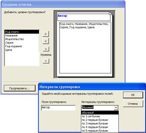 Рисунок 36 – Первое окно мастера отчетов 3. Во втором диалоговом окне мастера вы можете задать, по каким полям данных из таблицы или запроса должна осуществляться группировка записей. Например, если вы создаете отчет для таблицы Книги, то здесь можно указать поле Автор. В этом случае мастер создает отчет, в котором данные исходной таблицы объединены по авторам. Для каждого из выбранных полей можно задать интервал группировки, который определяет любой допустимый интервал значений поля или выражения. При выборе стандартной установки "По полному значению" автоматически производится группировка данных с одинаковыми значениями.Подтвердите установку нажатием кнопки Далее. 4. В следующее диалоговом окне мастера вы можете задать, по каким полям данных из таблицы или запроса должна осуществляться сортировка записей. Если поля группировки не заданы, то в следующем диалоговом окне можно указать порядок сортировки данных исходной таблицы или запроса. Если же поля группировки определены, то данное диалоговое окно содержит только те поля, которые не были выбраны в предыдущем окне, и в нем можно задать последовательность сортировки данных внутри группы. Кроме сортировки на этой вкладке можно производить вычисления. Для этого необходимо нажать кнопку Итоги. Пользовательские вычисления позволяют выполнять расчеты с числовыми и строковыми значениями или значениями дат и вычисляют сумму, среднее, минимальное и максимальное значение. Просуммируем цены на книги по каждому автору. Подтвердите установку нажатием кнопки Далее.