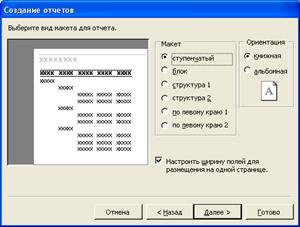Рисунок 39 – Выбор вида макета для отчета 6. Следующее окно позволяет выбрать стиль оформления отчета. В последнем диалоговом окне мастера следует задать имя отчета и нажать кнопку Готово. Мастер создает отчет, и MS Access откроет его в режиме предварительного просмотра. Конструктор отчетов Оформление отчета осуществляется в режиме конструктора. Переход из окна базы данных в режим конструктора осуществляется нажатием кнопки режим "Конструктор". Режим конструктора для отчетов очень похож на аналогичный режим для форм. Даже панель элементов для создания новых управляющих элементов та же. Однако в нем содержится одна пиктограмма, которая при создании форм не используется. Это пиктограмма Разрыв страницы.