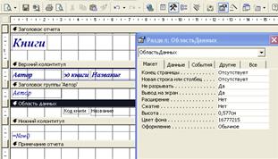 Рисунок 41 – Свойства области печати С помощью свойства Разрыв страницы вы определяете, должен ли осуществляться переход к новой странице перед началом области. Интересной является также свойство Не разрывать. Если установить для данного свойства значение Да, MS Access попытается напечатать управляющие элементы области на одной странице. Однако, если на текущей странице не достаточно места для всех управляющих элементов области, тогда MS Access печатает все управляющие элементы на следующей странице. Свойство Вывод на экран определяет, должна ли отображаться на экране данная область отчета. В отчетах некоторые из управляющих элементов содержат свойства Расширение и Сжатие. Аналогичные свойства в формах отсутствуют. MS Access предоставляет десятки встроенных функций, которые можно использовать для обработки данных или для добавления информации в отчет. Одним из видов информации, которая наиболее часто включается в отчет, является информация о дате подготовки отчета или номера текущих страниц. Для дат MS Access предоставляет две встроенные функции Date() и Now() возвращающие текущие системные даты. Чтобы добавить текущую дату в отчет, необходимо 1. открыть форму или отчет в режиме конструктора; 2. выбрать в меню Вставка команду Дата и время; 3. чтобы вставить текущую дату, установите флажок Формат даты и выберите нужный формат;