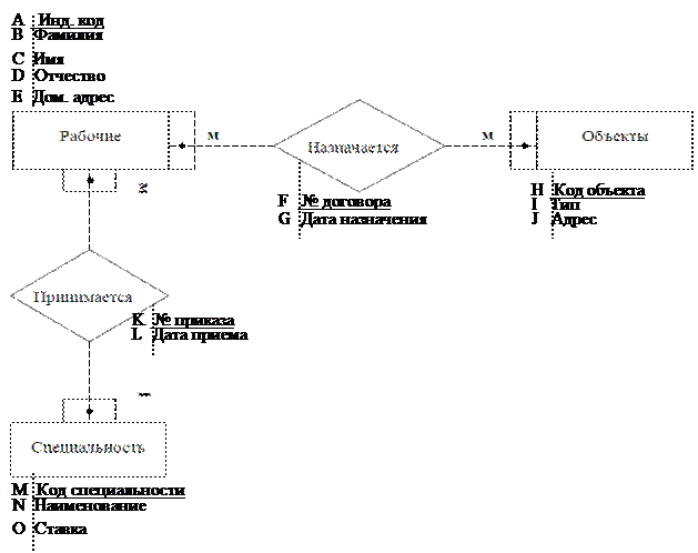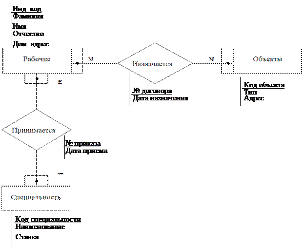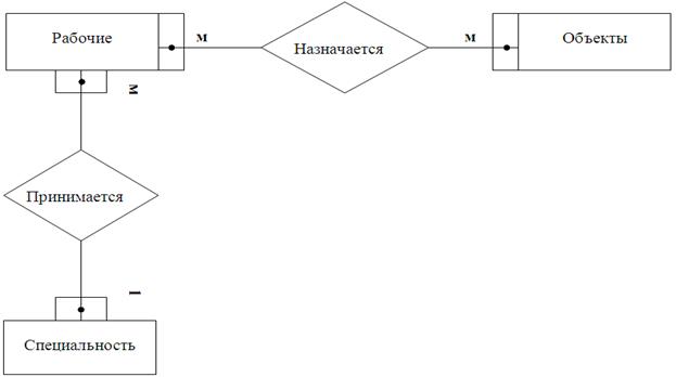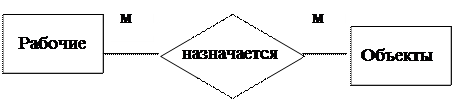 Все сущности находятся между собой в отношениях различной силы (степень связи). Одно-однозначные отношения (1:1) имеют место в том случае, когда каждому экземпляру первого объекта (А) соответствует только один экземпляр второго объекта (В) и, наоборот, каждому экземпляру второго объекта (В) соответствует только один экземпляр первого объекта (А). Одно-многозначные отношения (1:М) — это такие отношения, когда каждому экземпляру одного объекта (А) может соответствовать несколько экземпляров другого объекта (В), а каждому экземпляру второго объекта (В) — только один экземпляр первого объекта (А). Много многозначные отношения (M:М) — это такие отношения, когда каждому экземпляру одного объекта (А) могут соответствовать несколько экземпляров второго объекта (В), а каждому экземпляру второго объекта (В) может соответствовать тоже несколько экземпляров первого объекта (А). Между сущностями рабочие и объекты возникает отношение «назначается» (рисунок 1.2) и степень связи много со многими (М:М), т.к. один рабочий может быть назначен на множество объектов, и на один объект назначается много рабочих.