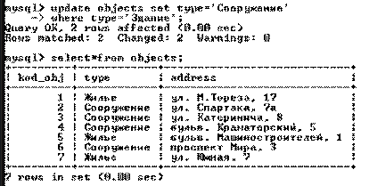 В инструкции, сразу после ключевого слова UPDATE указывается таблица tbl, которая подвергается изменению. В предложении SET перечисляются столбцы, которые подвергаются обновлению, и устанавливаются их новые значения. Необязательное условие WHERE позволяет задать критерий отбора строк – обновлению будут подвергаться только те строки, которые удовлетворяют условию where_definition. На рисунке 6.3 отображен пример использования оператора UPDATE, в котором запись «Здание» в таблице Objects изменяются на «Сооружение».