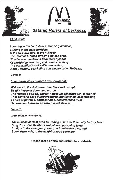ВВЕДЕНИЕ: Виднеется где-то вдали, восстает угрожающе, Таится в темных коридорах Нацистская свастика девяностых, Печально известная золотая арка, орошенная кровью. Символ зловещей и смертоносной торговой марки Всемирного терроризма и преступной деятельности. Олицетворение зла — вот чем является империя дьявольского, жадного до денег культа убийства коров, называемая МакСмерть.