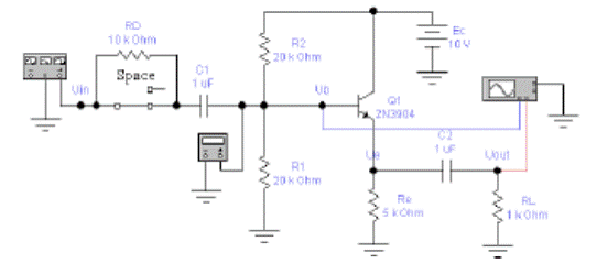 Установочные параметры приборов в схеме должны соответствовать установочным параметрам приборов на рисунке. Для удобства при проведении эксперимента оставьте увеличенным только изображение осциллографа и мультиметра. Мультиметр должен быть установлен для измерения постоянного напряжения. б) Включить схему. Измерить постоянные составляющие напряжения в точках Ub и Uе. Вычислить постоянные составляющие напряжения в точках Ub, Ue и ток эмиттера, используя значения параметров компонентов схемы (Ubэ= 0,7 В). Результаты записать в раздел "Результаты экспериментов". в) Закрыть увеличенное изображение мультиметра, оставив увеличенным только изображение осциллографа. Включить схему. Измерить амплитуды входного и выходного напряжения. Определить разность фаз между входным и выходным напряжением. По результатам измерений вычислить коэффициент усиления по напряжению. Вычислить коэффициент усиления эмиттерного повторителя по напряжению, используя параметры схемы. Записать результаты. г) Подключить резистор между точкой Uin и конденсатором С1, разомкнув ключ [Space]. Включить схему. Измерить амплитуды входного и выходного синусоидального напряжения. По результатам измерений амплитуды входного синусоидального сигнала в этом и предыдущем пунктах вычислить входной ток. По величинам IВХ и UBX вычислить дифференциальное входное сопротивление rвх. Записать результаты в раздел "Результаты экспериментов". д) Используя значения параметров компонентов схемы, вычислить входное сопротивление каскада rвх (β=200). е) Закоротить резистор, замкнув ключ [Space]. Изменить номинал резистора RL до 200 кОм. Затем включить схему и записать результаты измерения выходного напряжения в раздел "Результаты экспериментов". Это напряжение приблизительно равно напряжению холостого хода, так как сопротивление 200 кОм можно считать разрывом цепи. Уменьшить значение этого сопротивления до 200 Ом и снова включить схему. Измерить амплитуду напряжения на нагрузке. Вычислить выходное сопротивление каскада по результатам измерений. Запишите значения напряжения холостого хода, напряжения на нагрузке и выходного сопротивления каскада в раздел "Результаты экспериментов".