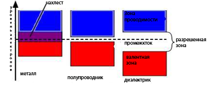 Рисунок 1: Упрощенная зонная диаграмма для проводников, полупроводников и диэлектриков. По взаимному расположению зон вещества делят на три большие группы (см. Рисунок 1): проводники — зона проводимости и валентная зона перекрываются, образуя одну зону, называемую зоной проводимости, таким образом, электрон может свободно перемещаться между ними, получив любую допустимо малую энергию. Таким образом, при приложении к твердому телу разности потенциалов, электроны смогут свободно двигаться из точки с меньшим потенциалом в точку с большим, образуя электрический ток. К проводникам относят все металлы. полупроводники — зоны не перекрываются и расстояние между ними составляет менее 3.5 эВ. Для того, чтобы перевести электрон из валентной зоны в зону проводимости требуется энергия меньшая, чем для диэлектрика, поэтому чистые (собственные, нелегированные) полупроводники слабо пропускают ток. диэлектрики — зоны не перекрываются и расстояние между ними составляет более 3.5 эВ. Таким образом, для того, чтобы перевести электрон из валентной зоны в зону проводимости требуется значительная энергия, поэтому диэлектрики ток практически не проводят. Эн е ргия актив а ции, разность между значениями средней энергии частиц (молекул, радикалов, ионов и др.), вступающих в элементарный акт химической реакции, и средней энергии всех частиц, находящихся в реагирующей системе.