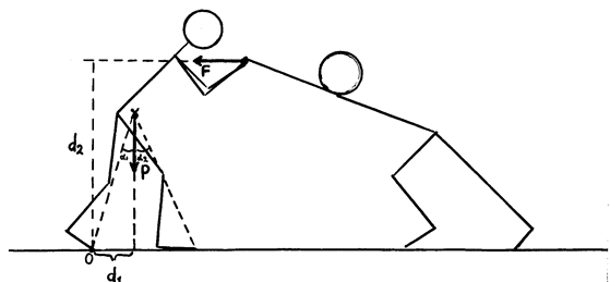 М уст mgd 1 К уст = ——— = —— (2.59) М откл Fd 2 где d1 и d2 – соответственно плечи силы тяжести и опрокидывающей силы (F) относительно оси, проходящей через точку опрокидывания (О). Тело сохраняет устойчивое положение, если величина коэффициента устойчивости больше или ровна единице. При снижении данного показателя до значения меньше единицы тело будет опрокидываться. Угол устойчивости – это угол, образованный вертикалью и линией, соединяющей ОЦТ с граничной точкой опоры, относительно которой возможно опрокидывание тела. Этот угол обозначен на рисунке как a 1 – в направлении "назад" и a 2 – в направлении "вперед". Последняя характеристика позволяет оценить способность тела сопротивляться опрокидыванию вне зависимости от величины силы, стремящейся к этому. Так, чем большее значение имеет данный угол, тем более устойчивым является тело. Исходя из оценки угла устойчивости, можно сделать заключение о влиянии высоты расположения ОЦТ тела на его устойчивость по отношению к опрокидыванию. Так, тело будет тем устойчивее, чем ниже расположен его ОЦТ.