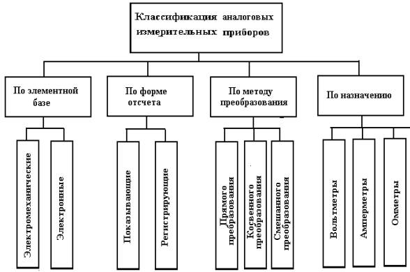 Аналоговый измерительный прибор — измерительный прибор, показания которого или выходной сигнал являются непрерывной функцией изменений измеряемой величины Аналоговые измерительные приборы, как правило, обеспечивают выполнение прямых измерений, отсчет результата измерений производится по шкале. Режим измерений, выполняемых аналоговыми средствами измерений - статический. Большинство аналоговых измерительных приборов - стрелочные с неподвижной шкалой и подвижной стрелкой, перемещение которой (поворот или линейное перемещение) относительно шкалы функционально взаимнооднозначно связано со значением измеряемой величины. Другие разновидности аналоговых измерительных приборов: - с неподвижной стрелкой или иным указателем и подвижной шкалой, - с линейным индикатором в виде совмещенной со шкалой полосы, длина которой функционально взаимно однозначно связана со значением измеряемой величины (например, ртутный термометр). Одна из возможных классификационных схем аналоговых измерительных приборов показана на рис.1.2.