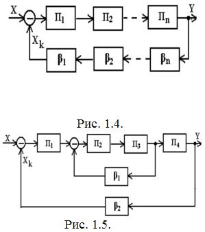 В аналоговых приборах прямого преобразования (действия) (рис. 1.3) входной сигнал Х преобразуется одним или несколькими преобразователями П1, П2, П3, … в дном направлении т входа к выходу. В аналоговых приборах уравновешивающего преобразования (рис. 1.4) входная величина Х компенсируется величиной ХК, представляющей собой выходную величину Y, преобразованную цепью обратного преобразования (обратные преобразователи β1, β2, β3, …, βn). Схемы аналоговых приборов уравновешивающего преобразования могут включать в себя узлы, охваченные местной обратной связью β1 (рис. 1.5), однако определяющим является наличие общей с выхода на вход отрицательной обратной связи β2.