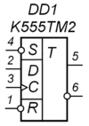 Пример условного графического обозначения (УГО) D-триггера с динамическим синхронным входом С и с дополнительными асинхронными инверсными входами S и R
