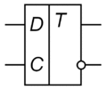 D-триггер (D от англ. delay — задержка[13][14][15] либо от data [16] - данные) — запоминает состояние входа и выдаёт его на выход. D-триггеры имеют, как минимум, два входа: информационный D и синхронизации С. После прихода активного фронта импульса синхронизации на вход С D-триггер открывается. Сохранение информации в D-триггерах происходит после спада импульса синхронизации С. Так как информация на выходе остаётся неизменной до прихода очередного импульса синхронизации, D-триггер называют также триггером с запоминанием информации или триггером-защёлкой. Рассуждая чисто теоретически, парафазный (двухфазный) D-триггер можно образовать из любых RS- или JK-триггеров, если на их входы одновременно подавать взаимно инверсные сигналы. D-триггер в основном используется для реализации защёлки. Так, например, для снятия 32 бит информации с параллельной шины, берут 32 D-триггера и объединяют их входы синхронизации для управления записью информации в защёлку, а 32 D входа подсоединяют к шине. В одноступенчатых D-триггерах во время прозрачности все изменения информации на входе D передаются на выход Q. Там, где это нежелательно, нужно применять двухступенчатые (двухтактные, Master-Slave, MS) D-триггеры.