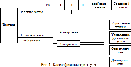 Триггеры являются простейшими ПЦУ. Отличительными особенностями триггеров являются: 1) число внутренних устойчивых состояний равно двум, чему соответствует одна переменная в прямой ( 2) число выходов у триггера также равно двум, один из них называют прямым, другой – инверсным. Причем значения выходов равны соответствующим значениям внутренней переменной. Поэтому для триггеров принято прямой выход обозначать – Классификация триггеров может осуществляться по ряду признаков. Основным из них является признак логического функционирования, при использовании которого триггеры разделяют по виду характеристического уравнения (так применительно к триггерам называется уравнение переходов). Еще одним важным классификационным признаком является способ записи информации в триггеры. Классификация триггеров по указанным признакам приведена на рис.1.