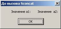 Sub Test_Sconcat() Dim a1 As String Dim a2 As String a1 = " Значение a1:" a2 = " Значение a2:" MsgBox a1 & a2,, "До вызова Sconcat" MsgBox Sconcat(a1, a2),, "При вызове Sconcat" MsgBox a1 & a2,, "После вызова Sconcat"
