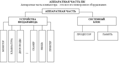 Различные устройства ПК связаны между собой каналами передачи информации. Из внешнего мира информация поступает в компьютер через устройства ввода. Поступившая информация попадает во внутреннюю память. Если требуется длительное ее хранение, то из внутренней памяти она переписывается во внешнюю. Обработка информации осуществляется процессором при непрерывной связи с внутренней памятью: оттуда извлекаются исходные данные, туда же помещаются результаты их обработки. Из внутренней памяти информация может быть передана во внешний мир через устройства вывода. Работа любого компьютера осуществляется благодаря взаимосвязи двух компонентов: аппаратной части (hardware) и программного обеспечения (software).