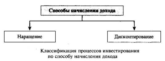 Рыночная экономика предоставляет предприятиям, осуществляющим производственную деятельность, возможность размещать свои временно свободные денежные средства на условиях срочности, платности, возвратности с целью: 1) получения процентного или дисконтного, а также курсового дохода; 2) сохранения денежных средств от инфляционного обесценения. Основными характеристиками любого объекта инвестирования являются: 1) первоначально размещаемая (исходная, номинальная) сумма денежных средств (PV); 2) доход в процентном выражении (процентная ставка — г или ставка дисконта — d); 3) единичный промежуток (стандартный интервал) начисления дохода; 4) возвращаемая сумма (сумма погашения) (FV). В зависимости от того, какие заданы характеристики, изменяются направления движения денежных потоков, генерируемых инвестицией. Классификацию процессов инвестирования по способу начисления дохода наглядно иллюстрирует рисунок.