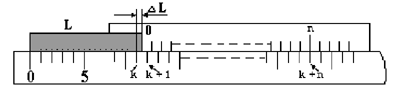 МЕТОД ЛИНЕЙНОГО НОНИУСА. Нониусом называется небольшая дополнительная шкала к обычному масштабу, позволяющая увеличивать точность в 10-20 раз. Линейным нониусом называется маленькая линейка с делениями, которая может скользить вдоль большой линейки также с делениями, называемой масштабом. Деления на нониусе наносятся обычно так, что одно деление нониуса составляет Именно это позволяет, пользуясь нониусом, производить отсчеты с точностью до1/m части наименьшего деления масштаба. Пусть расстояние между соседними штрихами масштаба y, а между соседними штрихами нониуса x. Можно записать, что x = y - (y/m).Величина Dx = y - x = y/mносит название точности нониуса. В любом положении нониуса относительно масштаба одно из делений первого совпадает с каким-либо делением второго. Отсчет по нониусу основан именно на способности глаза фиксировать это совпадение делений нониуса и масштаба. Рассмотрим теперь процесс измерения при помощи линейного нониуса. Пусть L — измеряемый отрезок Совместим с его началом нулевое деление основного масштаба. Пусть при этом конец его окажется между k и (k+1) делением этого масштаба. Тогда можно записать L = ky + DL, где DL — неизвестная пока доля k-го деления масштаба. Приложим теперь к концу отрезка L наш нониус так, чтобы нуль нониуса совпадал с концом этого отрезка. Так как деления нониуса не равны делениям масштаба, то обязательно найдется на нем такое деление n, которое будет ближе всего подходить к соответствующему (k+n) делению масштаба. Как видно из рис.1,