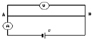 где R — сопротивление отрезка проволоки, L — его длина, S — площадь поперечного сечения, r — удельное сопротивление материала проволоки. Для измерения сопротивления собирают простейшую электрическую цепь (рис.4.). Участок цепи АВ — отрезок проволоки, Е — источник тока, А — амперметр, V — вольтметр. Сопротивление проводника можно определить по закону Ома для участка цепи где U — напряжение на концах участка цепи, I — текущий по цепи ток.