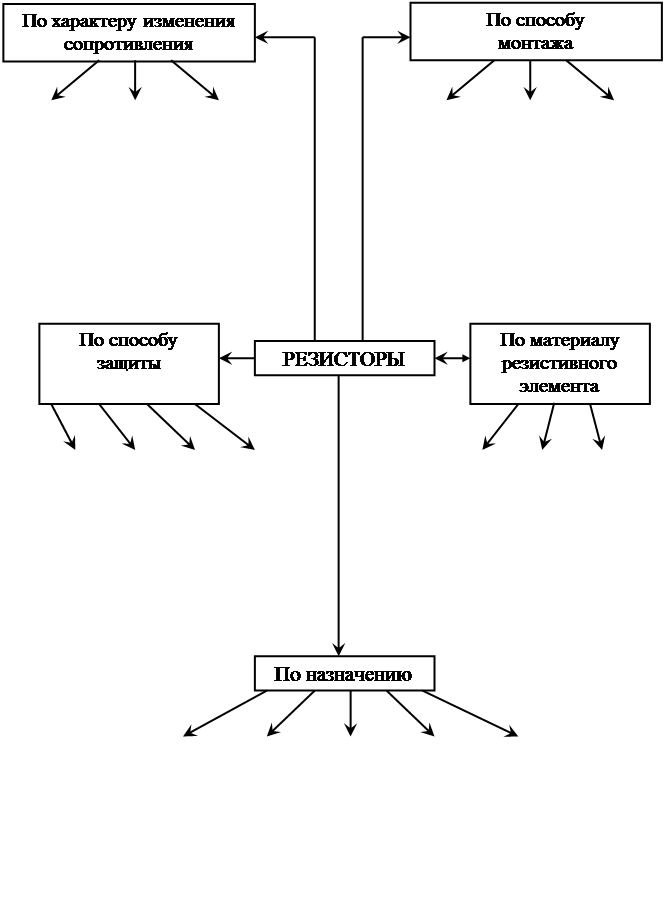 1.1. Классификация резисторов Общая классификация (рис. 1.1) составлена по ряду признаков присущих многим изделиям электронной техники: назначению; способу монтажа; способу защиты и т.п. В зависимости от назначения резисторы делятся на общего назначения и специальные (прецизионные и сверхпрецизионные, высокочастотные, высоковольтные, высокомегаомные). Резисторы общего назначенияиспользуются в качестве различных нагрузок, делителей в цепях питания, шунтов и т.п. Диапазон номинальных сопротивлений этих резисторов Прецизионные и сверхпрецизионные резисторыотличаются высокой стабильностью параметров при эксплуатации и большой точностью изготовления (допуск от ±0,0005 до 0,5 %). Применяются они в основном в измерительных приборах, вычислительной технике и системах автоматики. Диапазон их номинальных сопротивлений в ряде случаев шире, чем резисторов общего назначении. Мощности рассеяния этих резисторов сравнительно небольшие и, как правило, не превышают 2 Вт. Объясняется это высокими требованиями к стабильности, которые трудно выполнить при больших мощностях рассеяния. Высокочастотные резисторыотличаются малыми собственными индуктивностью и емкостью, предназначены для работы в высокочастотных цепях, кабелях и волноводах радиоэлектронной аппаратуры в качестве согласующих нагрузок, аттенюаторов, эквивалентов антенн и т.п. Непроволочные высокочастотные резисторы способны работать на частотах до сотен мегагерц и более, а высокочастотные проволочные – до сотен килогерц. Высоковольтные резисторырассчитаны на большие рабочие напряжения (от единиц до десятков киловольт). Применяются они в качестве делителей напряжения, искрогасителей в зарядных и разрядных высоковольтных цепях и т. п.