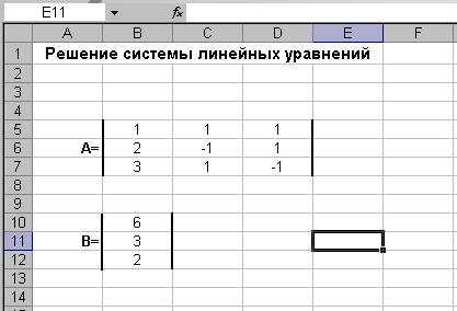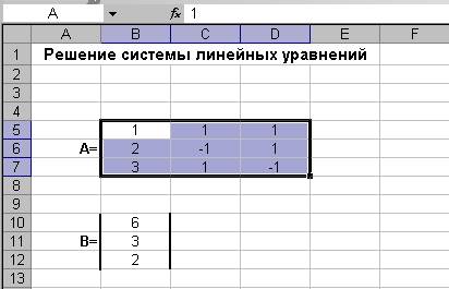Для решения системы линейных уравнений в MS Excel в рабочий лист следует ввести все данные, относящиеся к этой задаче: матрицу коэффициентов системы (т.е. матрицу А), а также вектор со значениями правых частей уравнений (вектор В). Такая таблица с внесенными в нее данными показана на рис. 1.