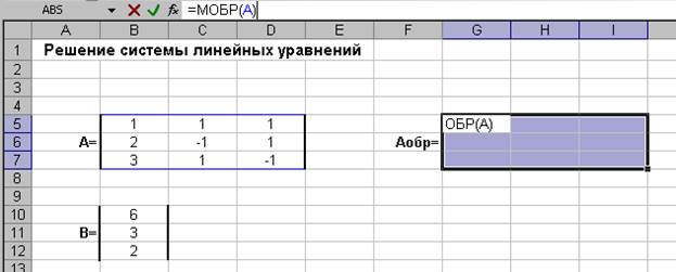 Рис. 4. Для того чтобы была применима именно к диапазону ячеек, необходимо нажать комбинацию клавиш Ctrl+Syift+Enter. В результате получим матрицу, обратную к А (рис. 5).