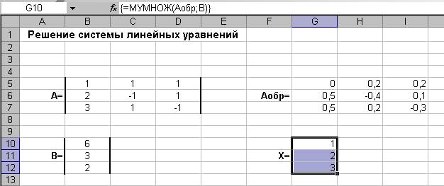 Рис. 6. В результате проделанных вычислений получаем вектор Х, элементы которого записаны в ячейки диапазона G10:G12 и определяют последовательно значения: X1 (ячейка G10), X2 (ячейка G11), X3 (ячейка G12).