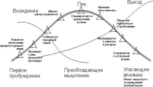 Принцип 4: Мимы возникают на Спирали подобно волнам Пробуждение новых мимов при спиральном движении происходит после того, как накапливается достаточная энергия для перехода к следующей системе – обычно вверх по спирали, но иногда и вниз. Хотя такой сдвиг может выглядеть случайным и хаотичным, тем не менее незамечаемые движения происходили под поверхностью на протяжении всего предшествующего времени. Новые системы мимов накатываются подобно волнам на пляже. У каждой есть свой гребень, стремящийся овладеть новыми условиям жизни в этом мире. В то же время каждая накладывается на предшествующую, уходящую систему. Иногда результат такой интерференции в целом замедляет движение вдоль Спирали и даже обращает его. Иногда же волны мимов входят в резонанс и усиливают друг друга, ускоряя эволюцию мышления. Каждая волна несет с собой семена своего рождения и смерти, остатки с предшествующих, затухающих систем и первые отблески грядущих способов бытия. Активная жизнь мима состоит из трех фаз: (1) Вхождение: Когда мим начинает пробуждаться, происходит подготовительный период и накапливается энергия. Это включает первоначальное формирование и оттачивание системы, а также период «Эврики!» – открытий и исследований. Это, можно сказать, возрастающий отрезок синусоиды. (2) Пик: Затем приходит интервал динамического напряжения и кажущейся стабильности в районе максимума. Условия жизни и мим синхронизированы, согласованы и уравновешивают друг друга. Конечно, в реальности все не так упрощенно, но это удобно принять в качестве модели. (3) Выход: За этим интервалом кажущейся стабильности следует период дезинтеграции, смутные времена, когда система становится разбалансированной и неэффективной, так как новые возникающие проблемы выходят за рамки ее способностей. Теперь мы находимся на скользком отлоге, и если обладаем внутренним потенциалом и ресурсами, готовимся к следующей волне.