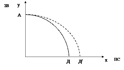 Якщо нововведення будуть здійснюватися у галузях, що виробляють предмети споживання, збільшення області виробничих можливостей буде зміщено праворуч донизу, що відображає графік на рис. 4.